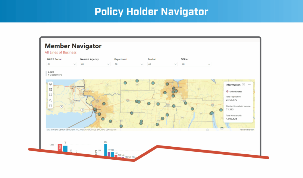 - Segments policyholders geographically, with overlays atop actual maps