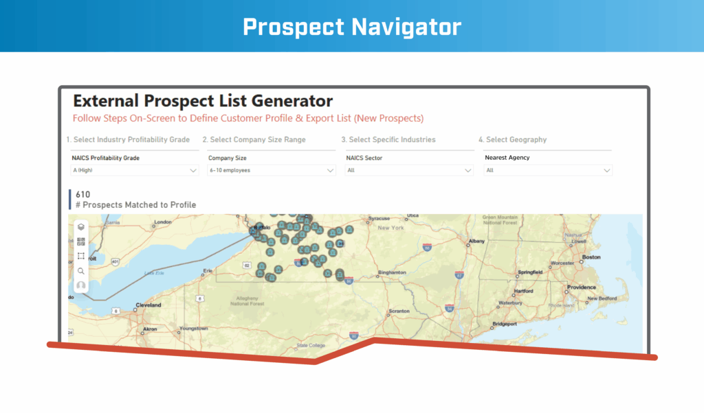 1. Insurance product performance navigator for market share. The Lab created this “navigator” to help your insurance carrier, brokerage, or agency to pinpoint which products to cross-sell/up-sell to the policyholders identified by the other navigators detailed below. This navigator specifically: