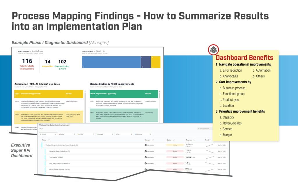 The Lab will then import these improvement opportunities into a centralized, navigable database. We also create an MS Power BI dashboard, which 3PL/4PL leaders can use to visualize, prioritize, and then plan which of those opportunities should be implemented—and in which order.